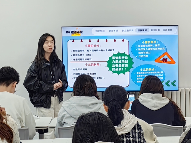 活动伊始,赵彤老师通过“什么是创业”这个问题引发了现场同学的深度思考。随后,她精准剖析了当代大学生在面对“财务自由”与“打工现状”时的心理博弈。其强调,在传统“考公、升本”的单一路径之外,创业不仅是一种职业替代方案,更是一场深刻的“自我定义”与思维重塑。同时,她还通过对比不同职业路径的特质,帮助学生厘清关键差异,鼓励他们在大学阶段勇于进行商业探索与实践。